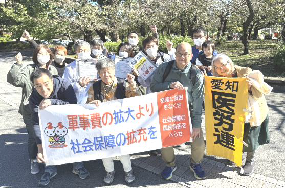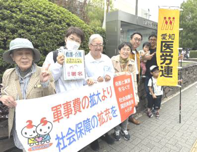1月3日、愛知社保協と共同で憲法を守ろう県民のつどいが行われた名古屋市公会堂前で署名行動を行いました。13人が参加し、夜勤規制署名104筆、名古屋市国保署名25筆、地域医療署名26筆、介護署名が4筆の計159筆が集まりました。自ら署名をしに来てくれる方も多数見えて、関心の高さがうかがえました。