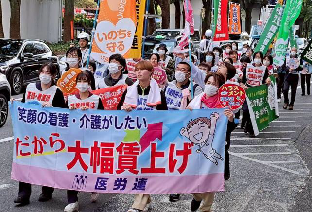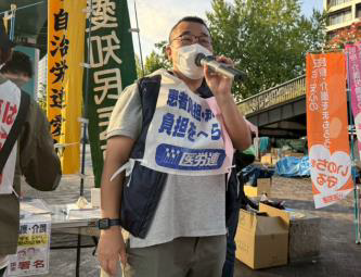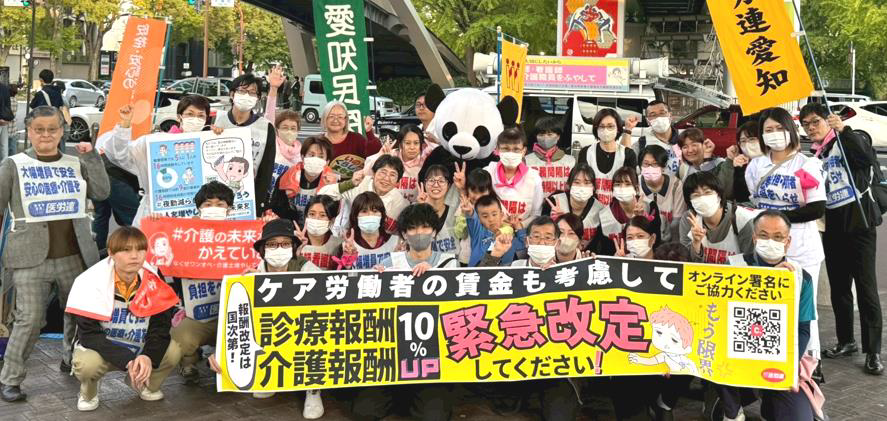 医療、介護は、どこも人手不足。低賃金の改善が求められる。政府は、診療報酬上げると言っているが全員に労働に見合った賃金にしていくには、私たちの運動次第、今日は、明るく楽しく署名やアピールをしよう