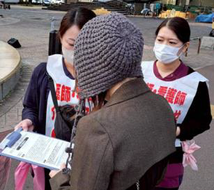 「私も看護師」と署名に応じてくれた方は、「夜勤どころか日勤でも人が少ない」と訴えに共感されました。