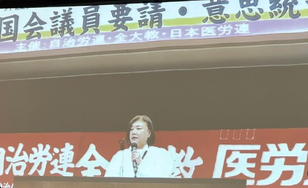 日本医労連・佐々木委員長は、挨拶で「人手不足で夜勤専従でもないのに夜勤が月10回以上になっているところもある。魅力ある職業にしていくために、夜勤の有害性学び、署名を集め紹介議員を増やし変えていいこう。報酬10%引き上げ団体署名、一言カードを国家に届けよう」と話しました。