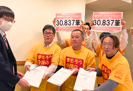 介護の交渉では、冒頭、集まった「介護職員を減らさないで~職員ふやして寄り添うケアがしたい~オンライン署名」 30,837筆を提出しました。